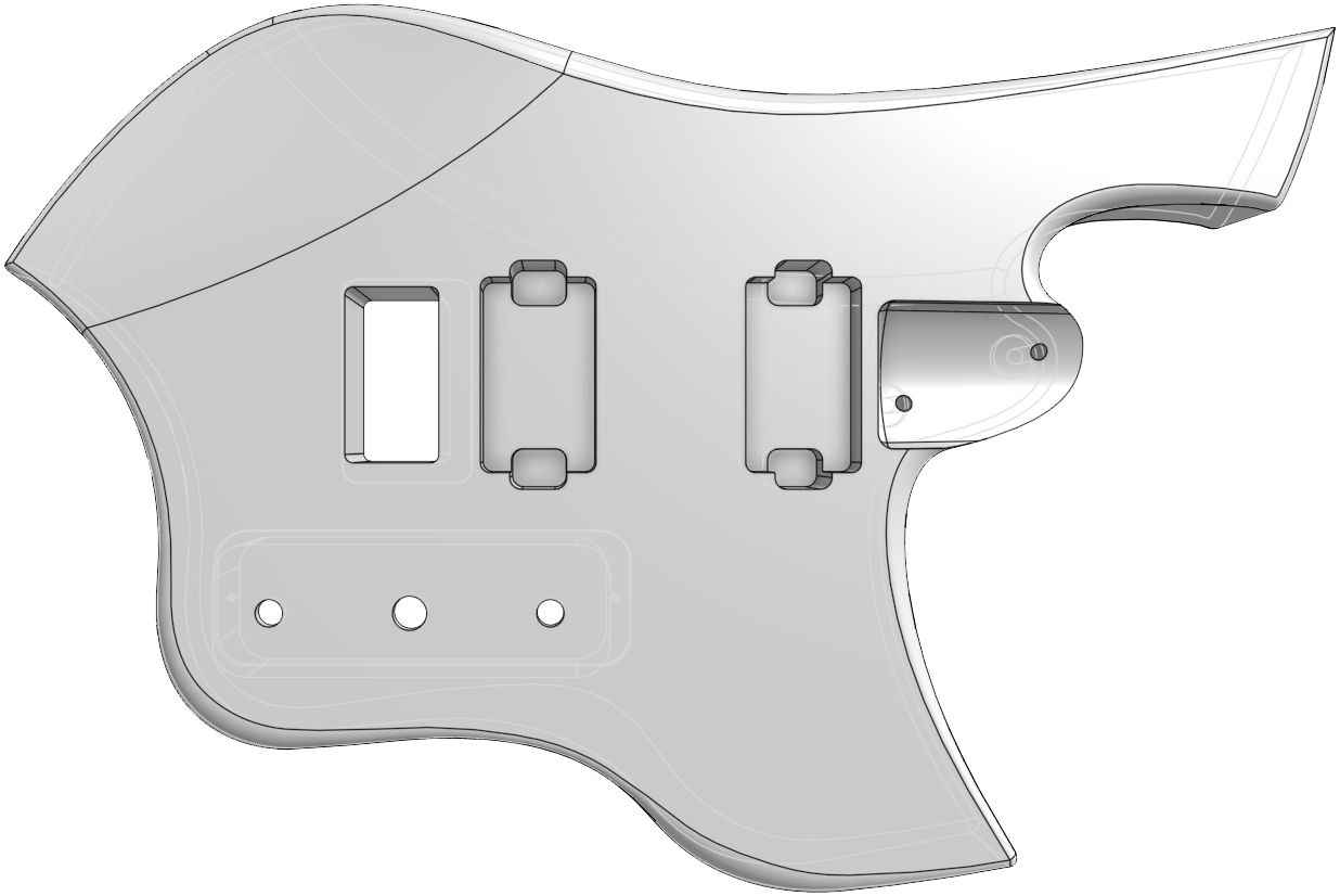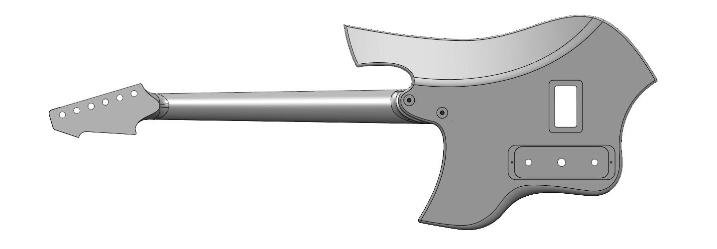The distinctive headstock, body contours, pickguard design and all emergent aspects of trade dress are the trademarks of Shane Sanders. The secondary meaning of the arrangement of design elements have their origins in Norse mythology and folklore and are sculptural expressions of brand identity. The headstock represents the prow of a Viking longship with a stylized animal head (dragon and sea-serpent). The inset shape represents both teeth and an iconified audio waveform. The body incorporates enveloping wing lines inspired by the Valkyrie and Swan Maiden motifs of ancient lore. And not one bit of it is anything more than creatively playing with the symbolic resonances of make-believe ancient tales the same way J.R.R. Tolkien and C.S. Lewis did it—mining old metaphors so that you can ride off into musical battle to protect the realm from threats from beyond. The elements are not intended to be religious or political expressions.
